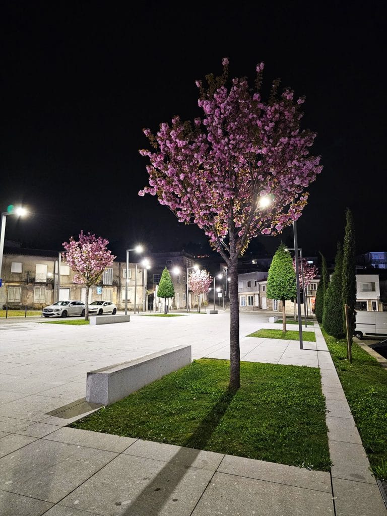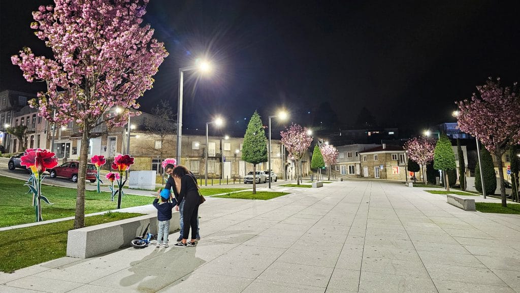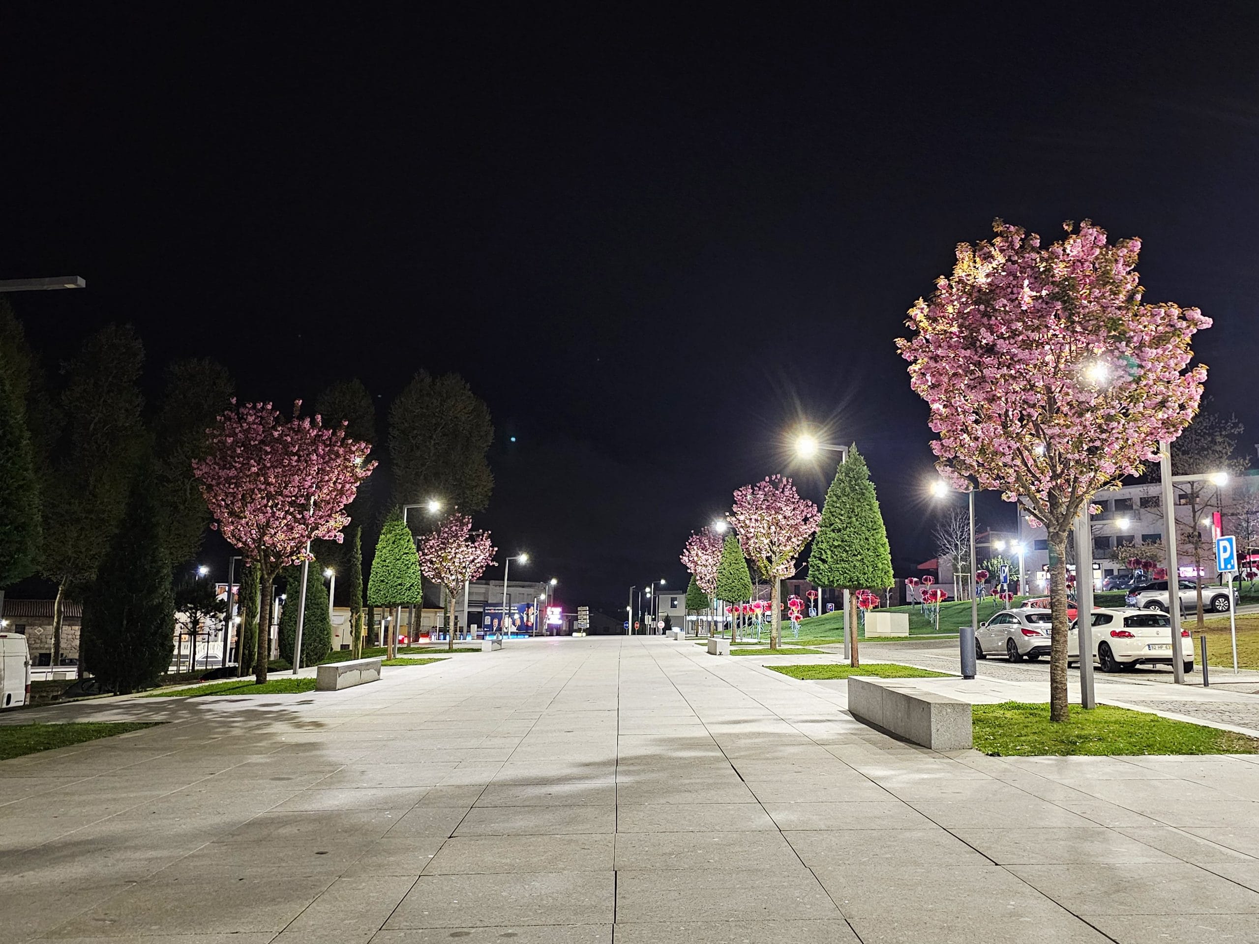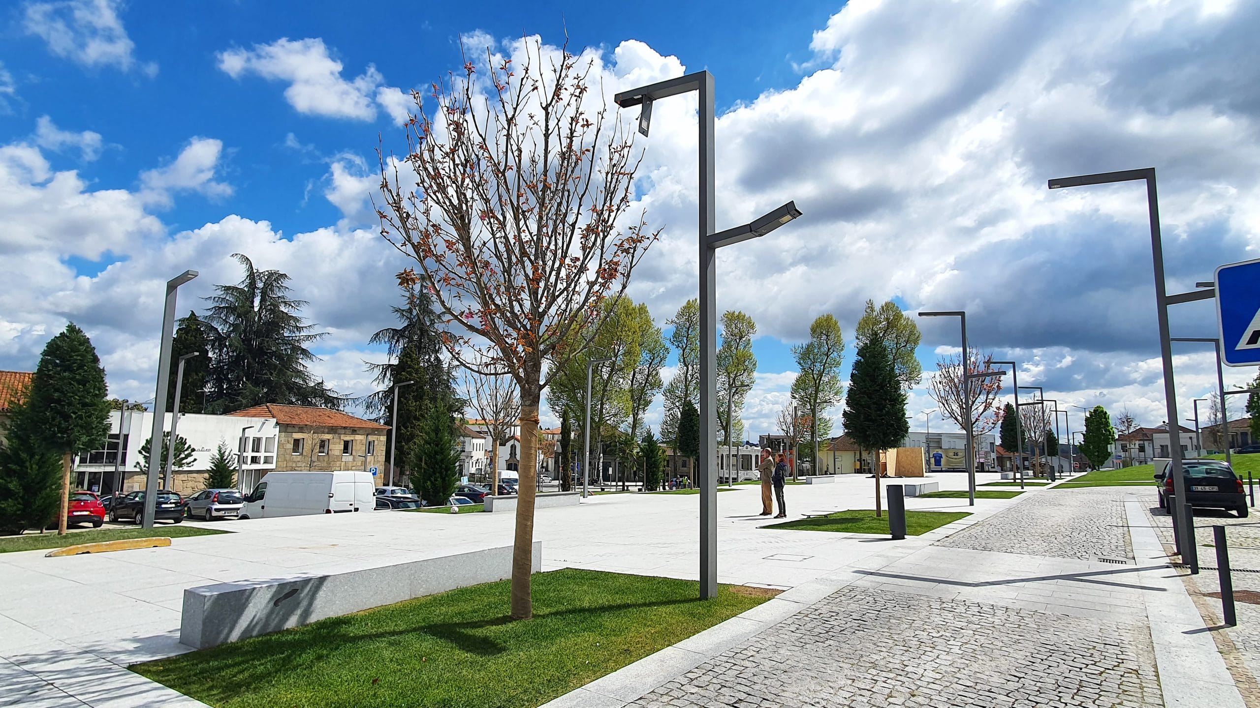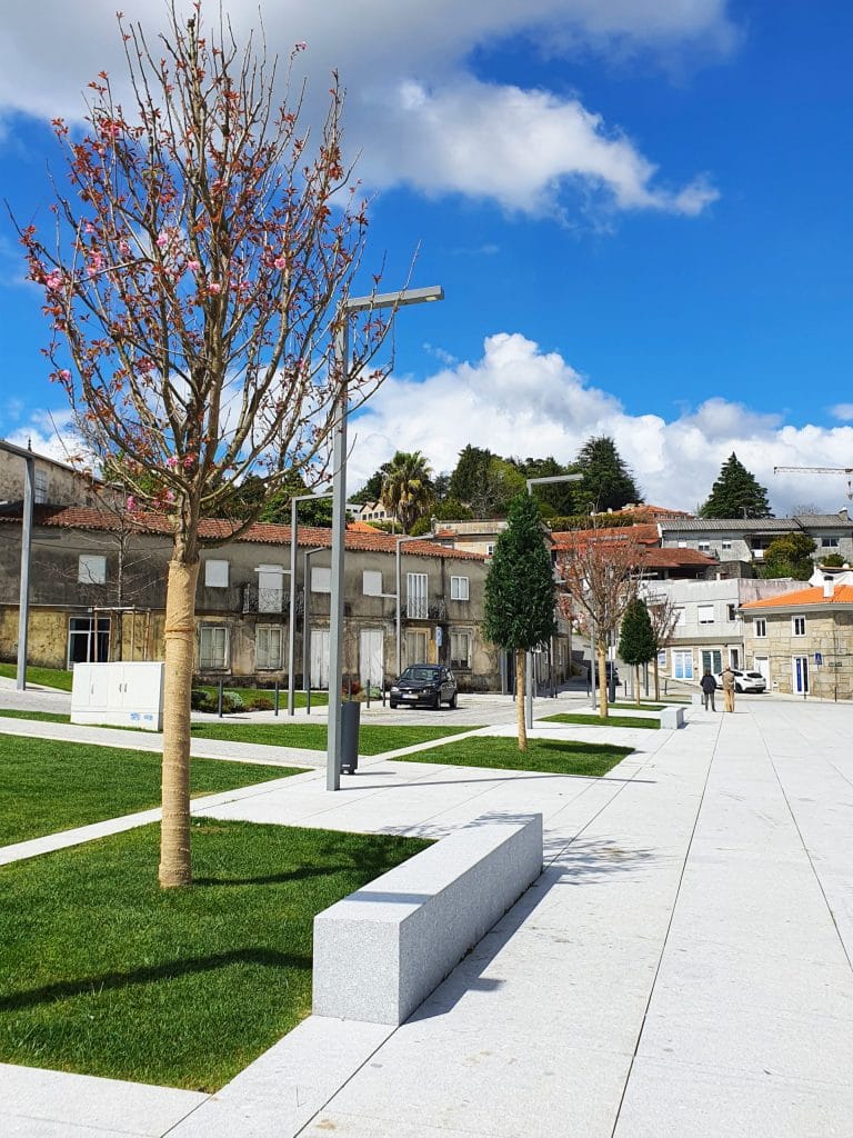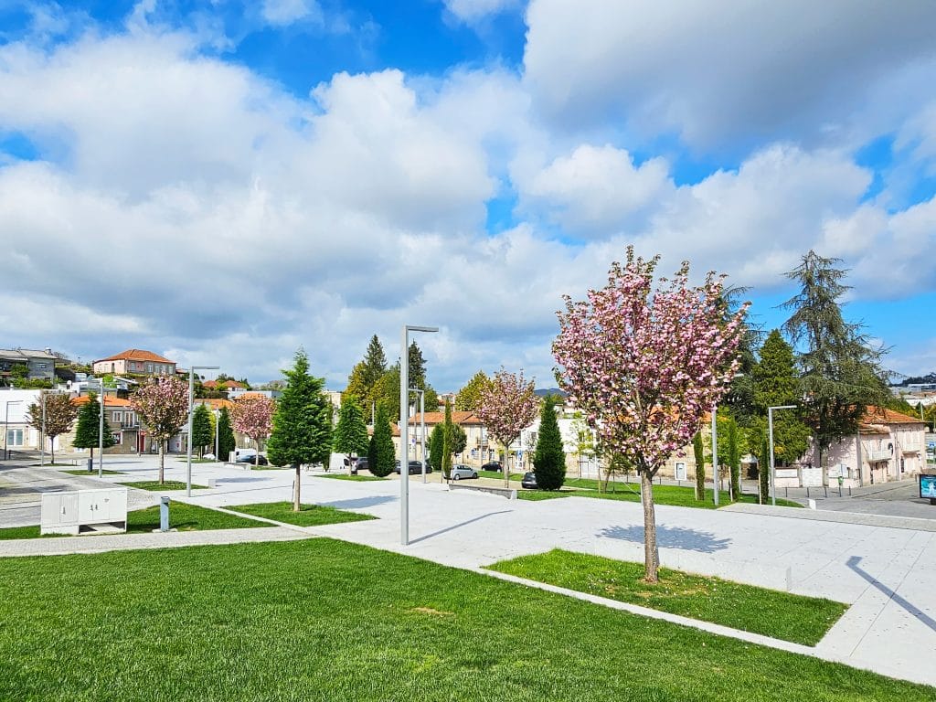 O projeto de requalificação procurou a regeneração do coração da cidade, conferindo-lhe uma plataforma-canal (praça) de nível. Esta plataforma é ladeada por áreas ajardinadas arborizadas que lhe conferem cor e o verde, destacando-se a floração das cerejeiras Prunus serrulata.
