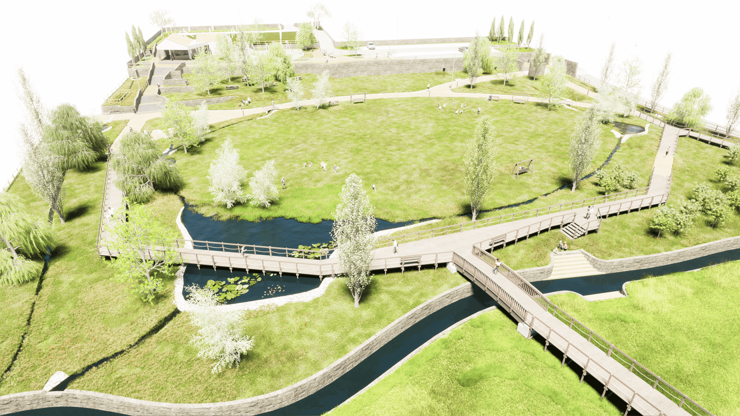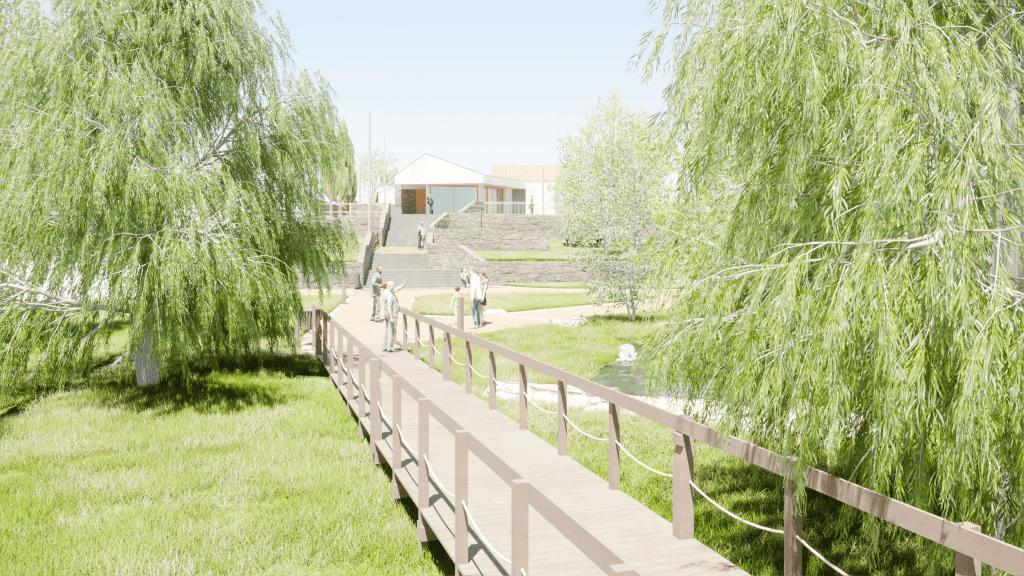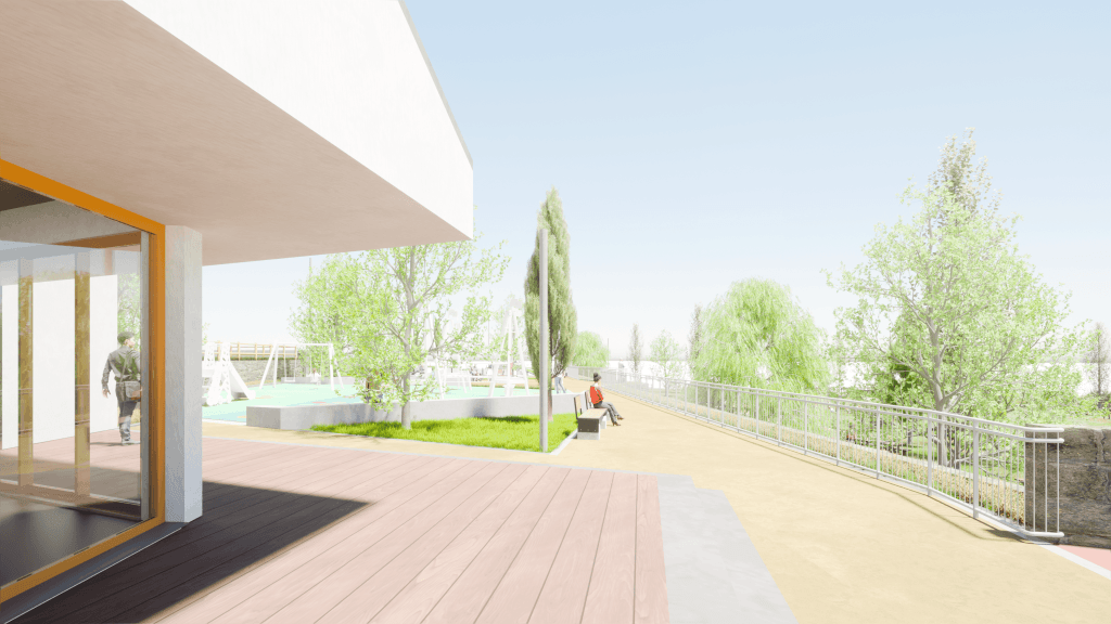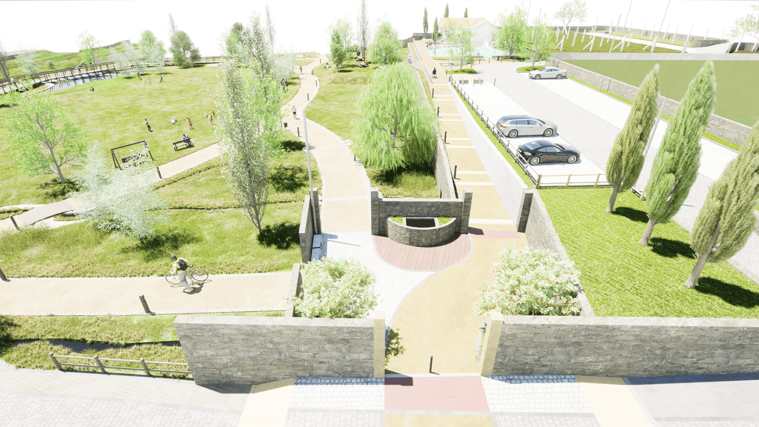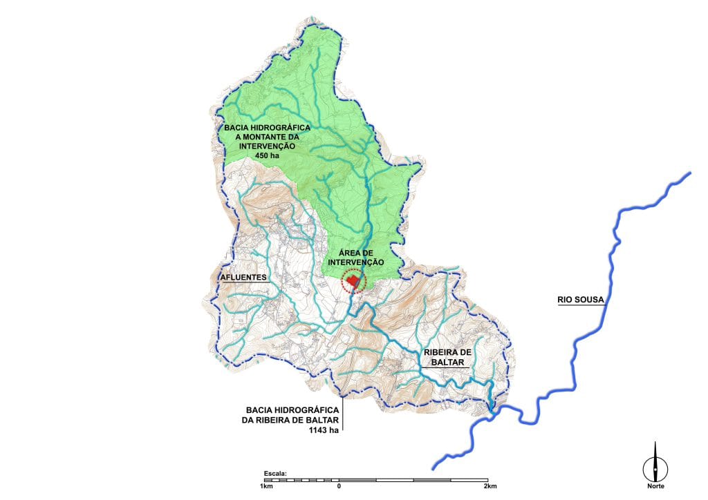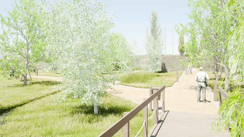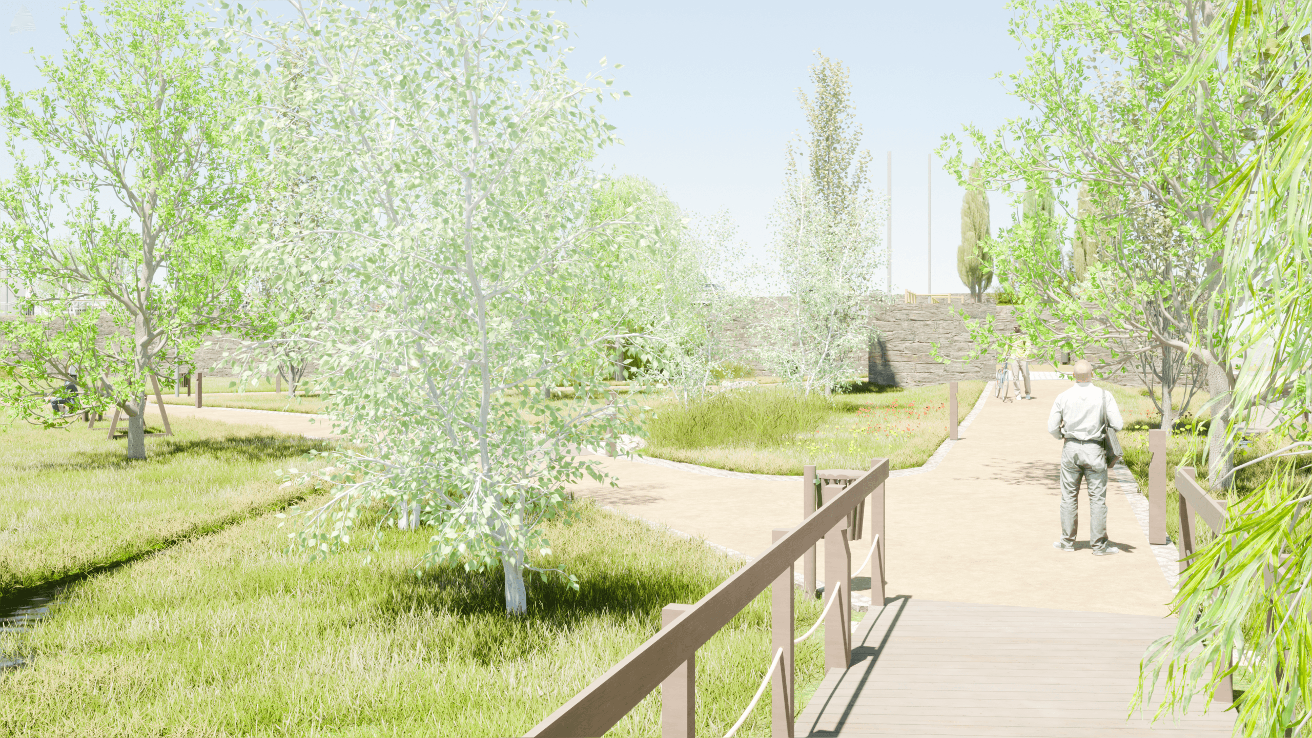 A proposta para o parque oferece um programa polivalente, dinâmico e adaptado, respeitando a essência do lugar. O espaço naturaliza-se à medida que caminhamos da cota alta para a cota baixa, em conformidade com os regimes do uso e ocupação do solo da REN e da RAN. O percurso guia o utilizador por entre os diferentes socalcos e zonas de estadia, em direção ao passadiço, à ponte pedonal e à Ribeira de Baltar.
