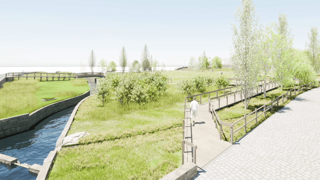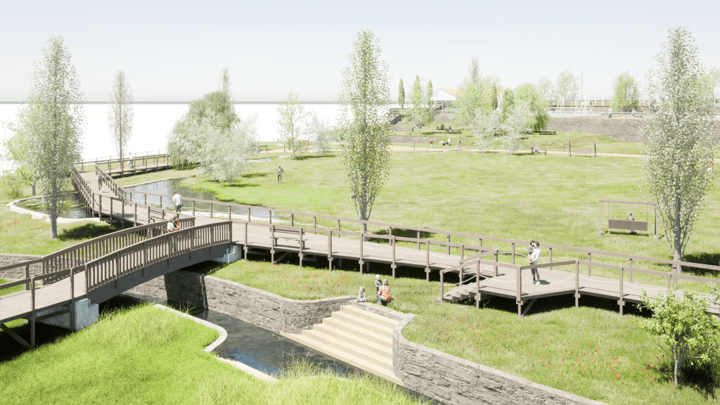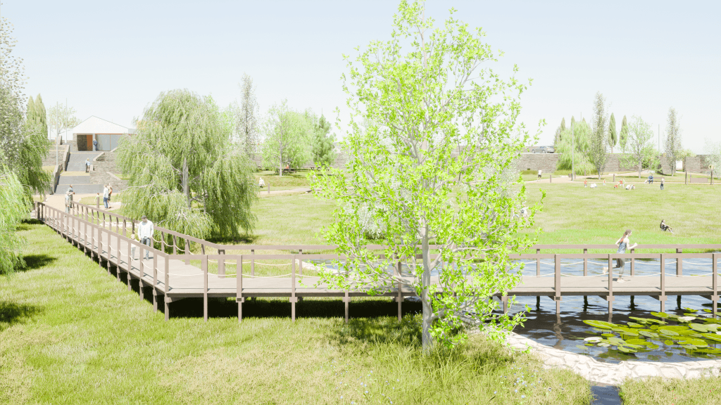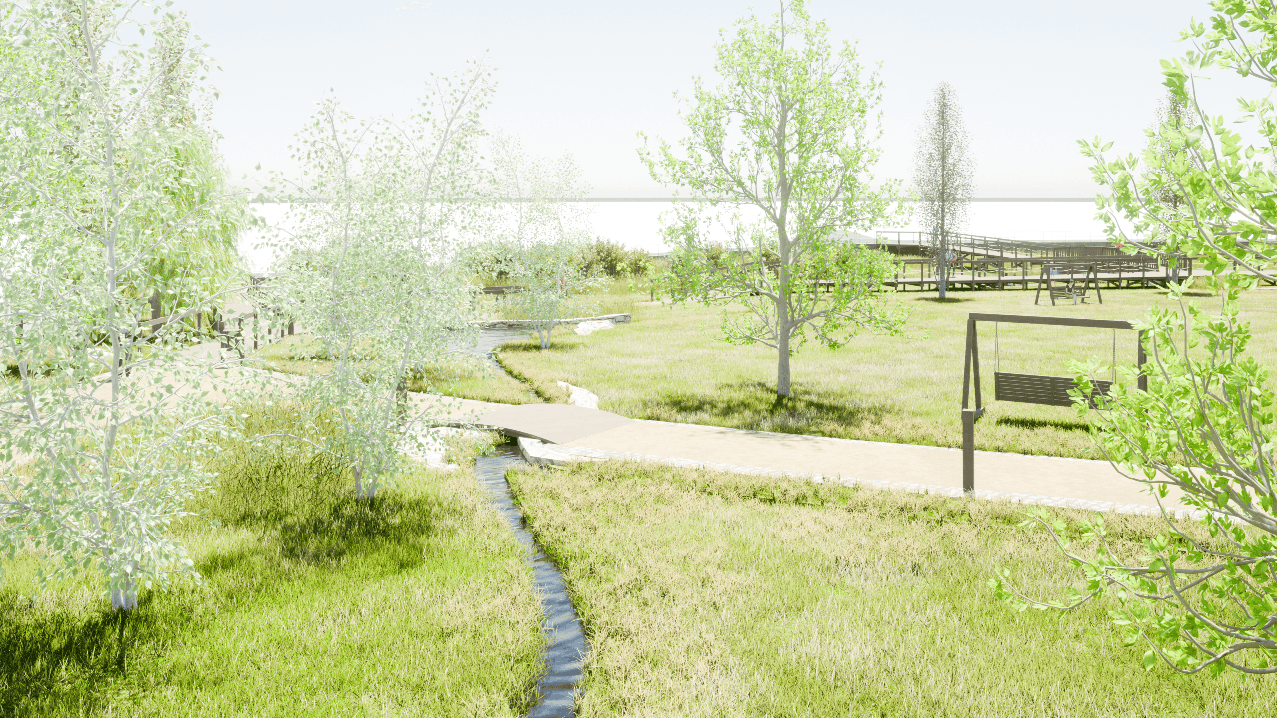 Entre áreas abertas e áreas mais intimistas à sombra de uma árvore, o parque disponibiliza mobiliário para baloiçar, sentar ou mesas de piqueniques. Jogos, charcos, circuitos da água e a iluminação adequada animam o espaço sazonalmente, enquanto um parque infantil permite aos mais novos libertarem energia.